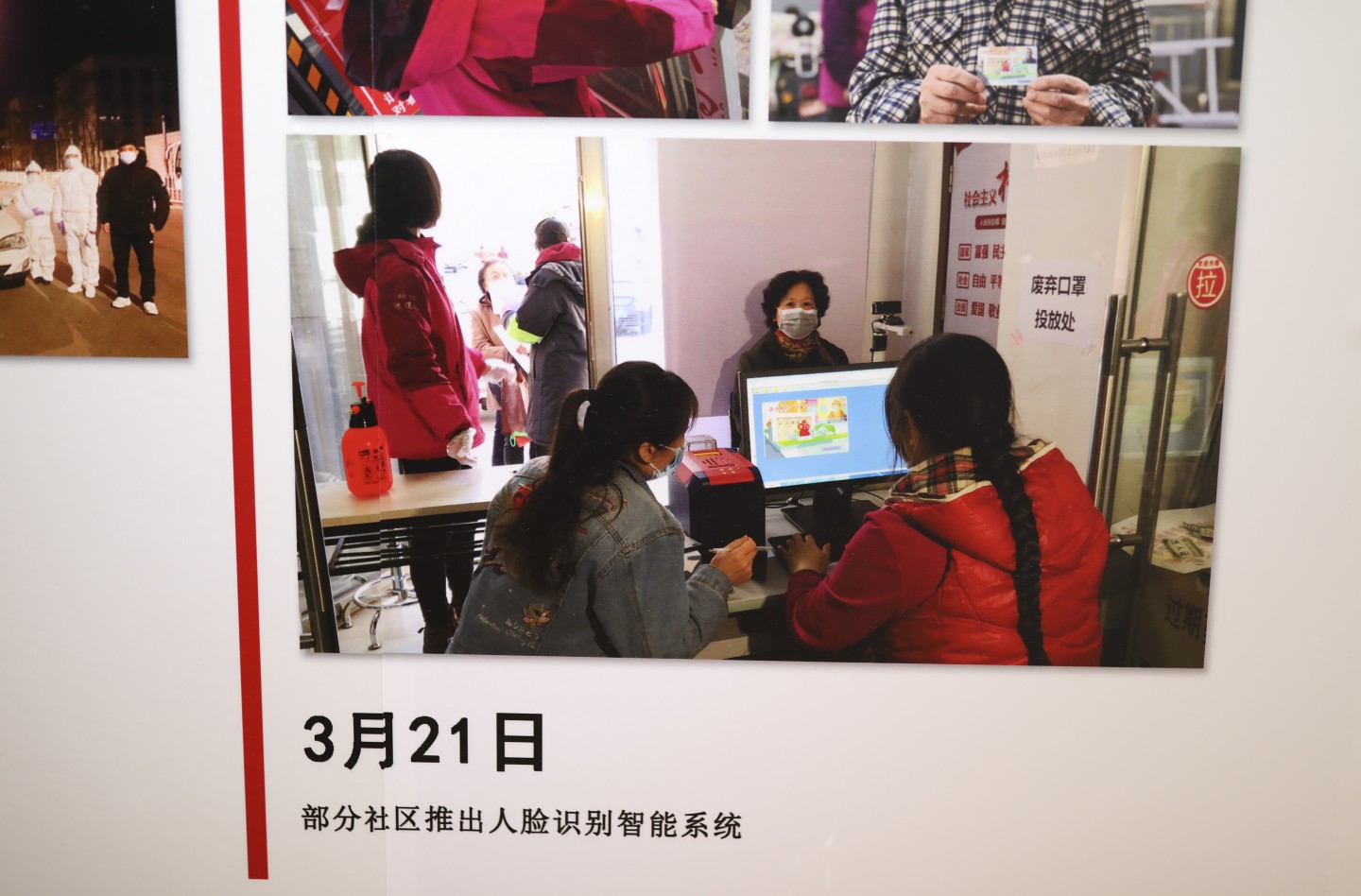 李美红在八角街道八角中里社区办的常设展——八角街道抗疫专题展中,有反映社区推出人脸识别智能系统的图文。新京报记者 浦峰 摄?