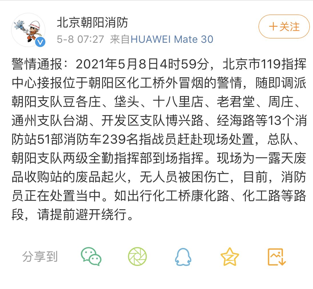 新京报讯(记者张静姝)5月8日7时27分,向阳消防传递称,4时59分接到位于向阳区化工桥外一露天成品收买站起火的警情,向阳消防支队13个消防站51部消防车239名指战员赶赴现场处理,无职员被困及伤亡。