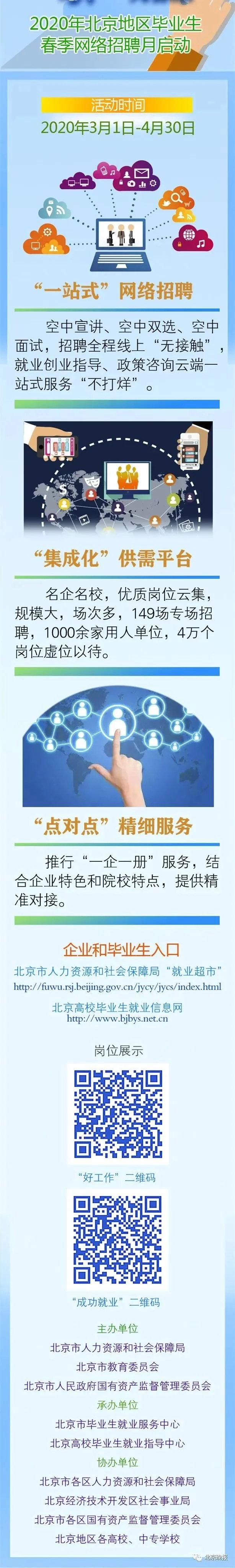 举动时期,用人单元和结业生可登录北京市人力资本和社会保证局官网的“失业超市”频道,北京高校结业生失业信息网进入雇用平台参与举动。别的,结业生还能够经由过程微信公家号“好事情”、“胜利失业”搜刮岗亭。
