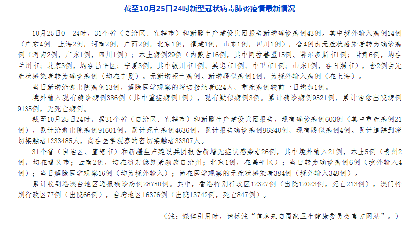 据国度卫健委网站动静,10月25日0—24时,31个省(自治区、直辖市)和新疆消费建立兵团陈述新增确诊病例43例。此中境外输入病例14例(广东4例,上海2例,河南2例,广西2例,北京1例,福建1例,山东1例,四川1例),含4例由无病症传染者转为确诊病例(河南2例,广东1例,四川1例);外乡病例29例(内蒙古16例,此中阿拉善盟15例、鄂尔多斯市1例;甘肃6例,均在兰州市;北京3例,均在昌平区;宁夏3例,此中银川市1例、吴忠市1例、中卫市1例;山东1例,在日照市),含2例由无病症传染者转为确诊病例(均在宁夏)。无新增灭亡病例。新增疑似病例1例,为境外输入病例(在上海)。